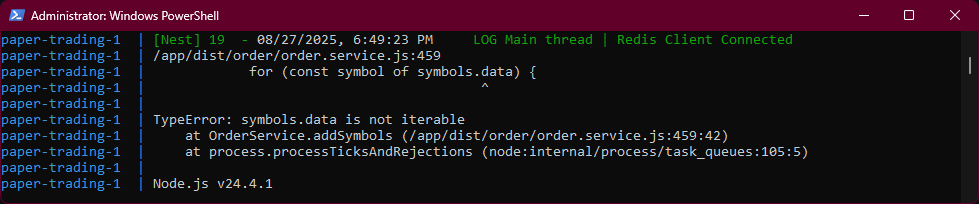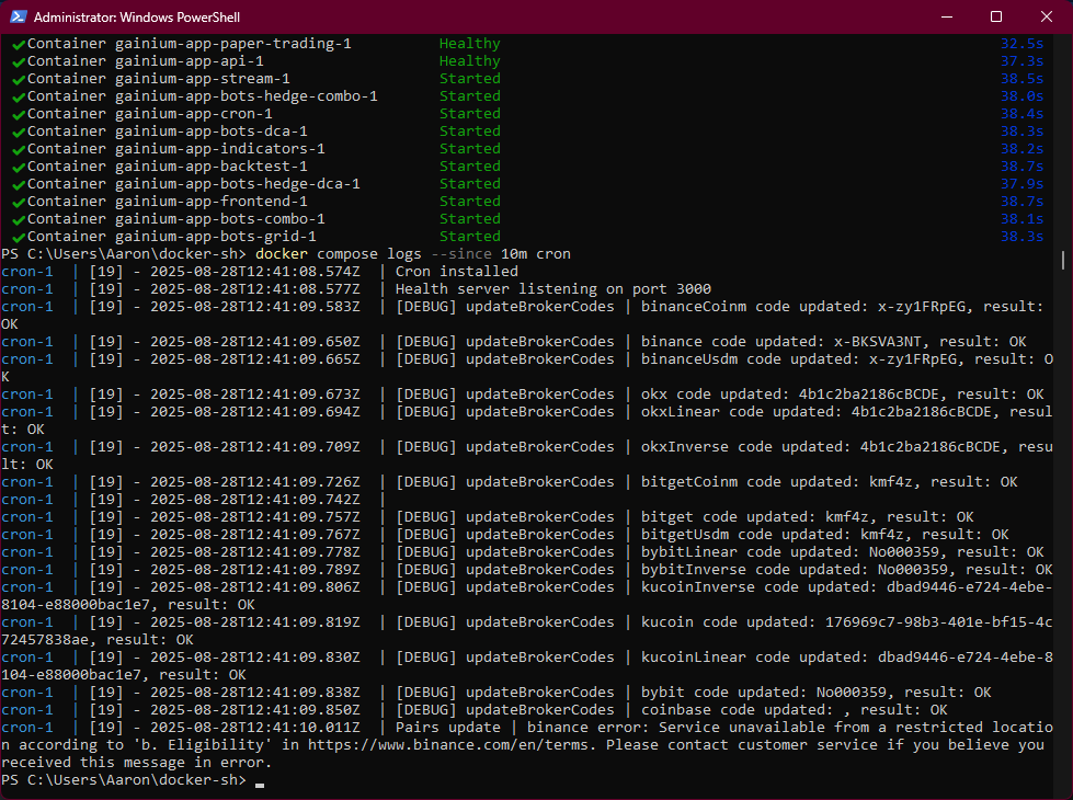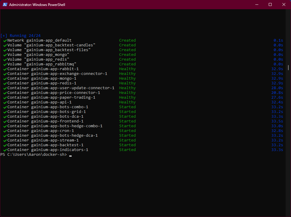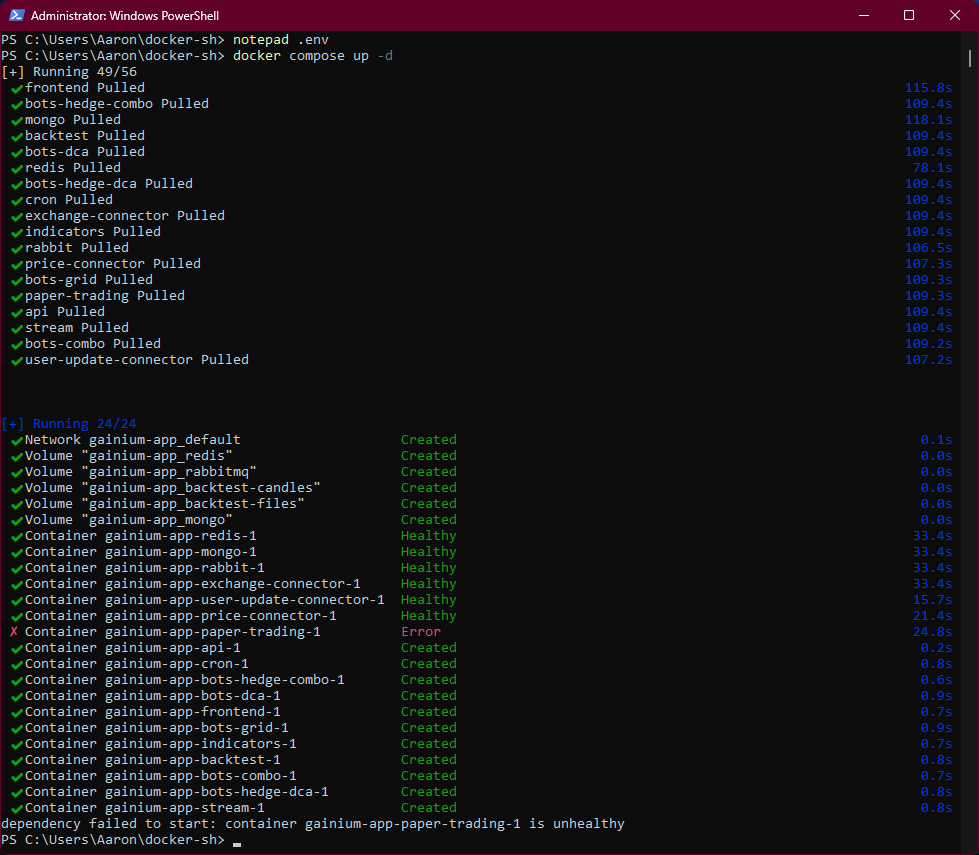 I’m not sure if this is a bug, but I’ve tried open source Gainium via Docker on Linux Mint and on Windows 11 (via WSL2 using Ubuntu), and I can’t get the paper-trading-1 container to start. I just deleted everything and started over from scratch with a new folder and getting it from github again. I copied the sample .env file and edited it with notepad to add my Coinbase API credentials (I’ve also tried without adding it), and then run docker compose up -d for the first time and here’s a screenshot of the service having an error and saying unhealthy.