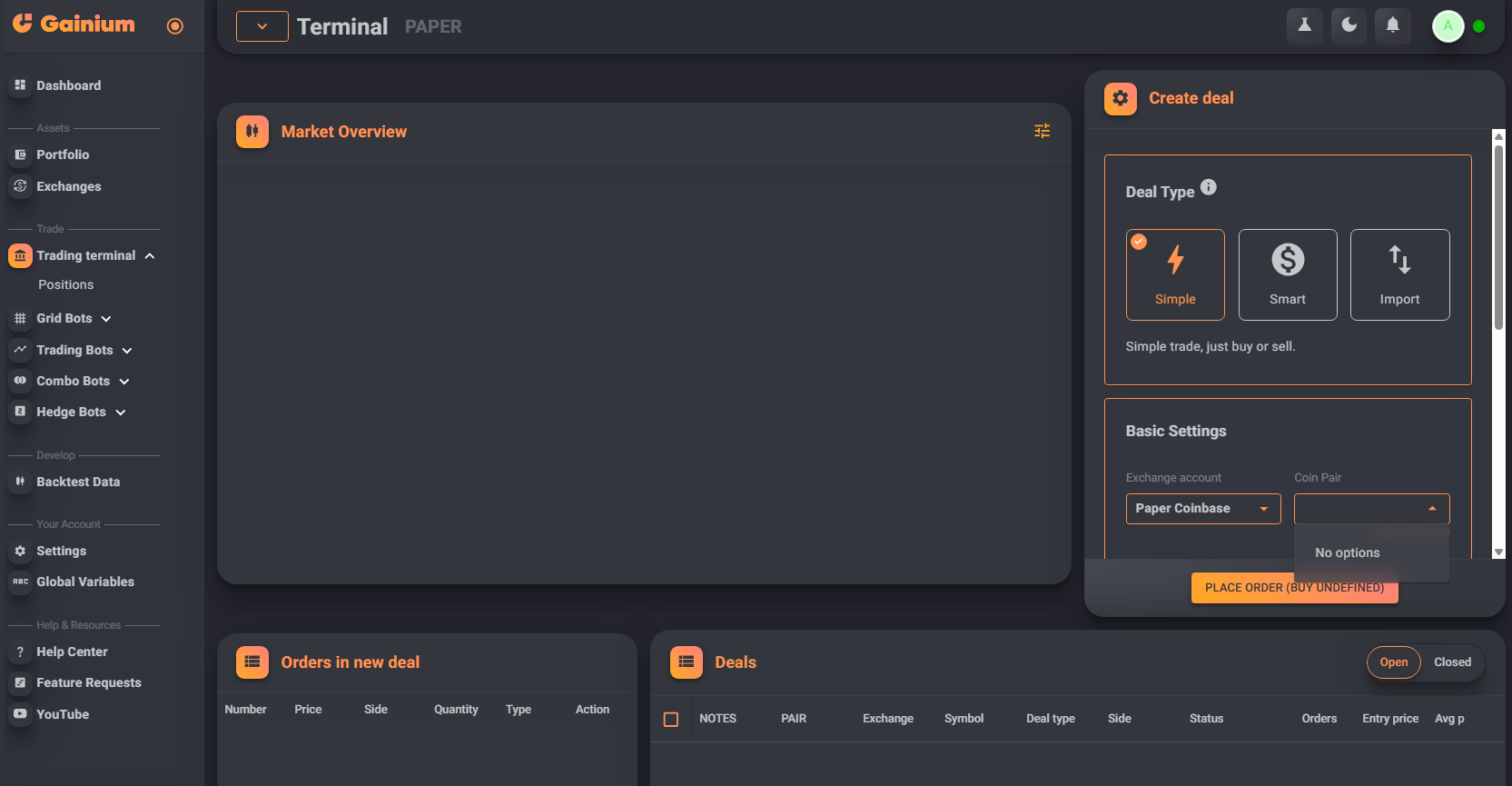 Probably related… I don’t see any pairs for a paper coinbase account. I tried PRICEROLE=all and added my coinbase key and secret and restarted, but still no market.