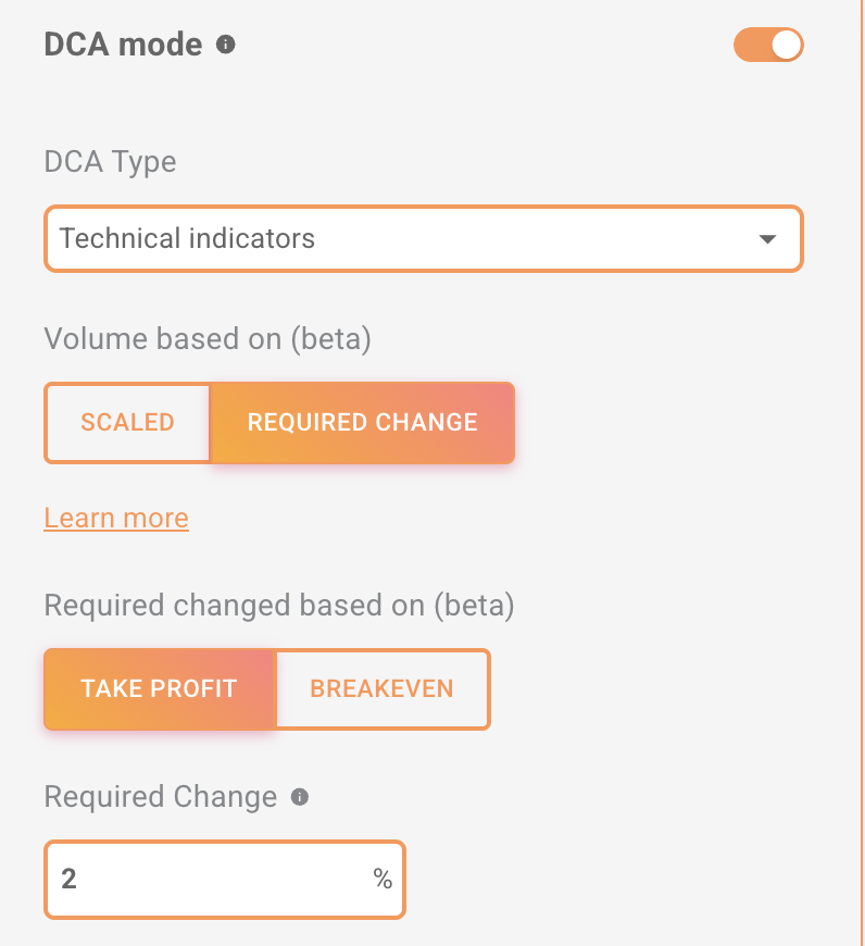Required change only affects DCA order size, have no affect on TP order. TP order when its percentage and not trailing is always limit.