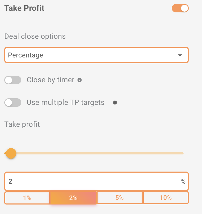TP in your settings is a simple percenatge of 2%. Order placed in advance based on filled orders of the deal.