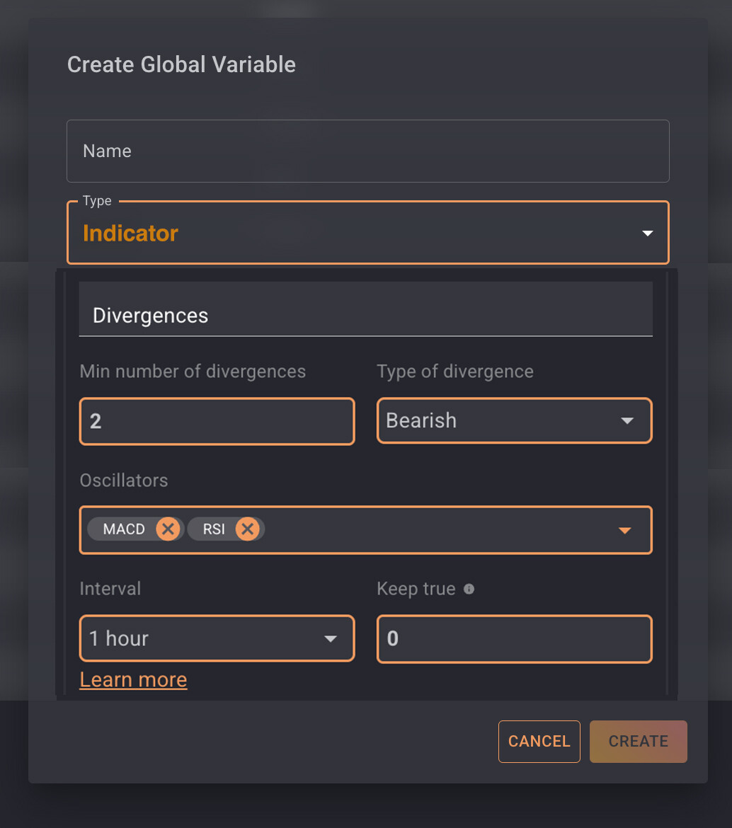 yep I think the difference between indicators and the rest of the variables is that indicators have their own settings so after selecting indicators in the ‘type’ menu (in the create global variable) we will have to use the same indicators interface as the one used when configuring the bot so we basically save the indicators settings and not only the indicator