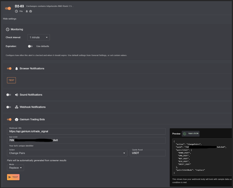 When pressing the “Test” button, the bot changes the pairs as expected, all seems to be fine! So it should also work when an alert is triggered.