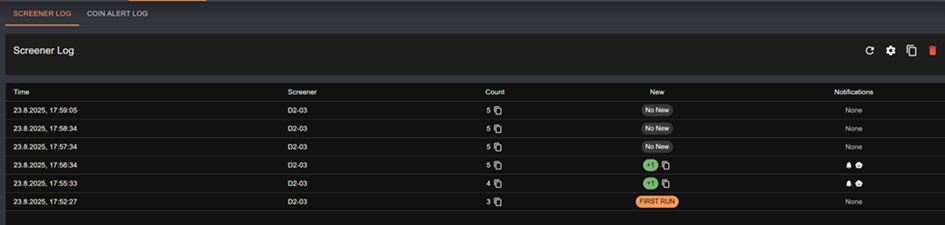 Webhook at 17:53h was the manual sent webhook with the “Test” button, this worked as expected. But the following two webhooks (17:55 and 17:56) from the screener alerts were received, but the coin pairs are not changed. And in addition we dont see the “i” after the “Received webhook action”!?