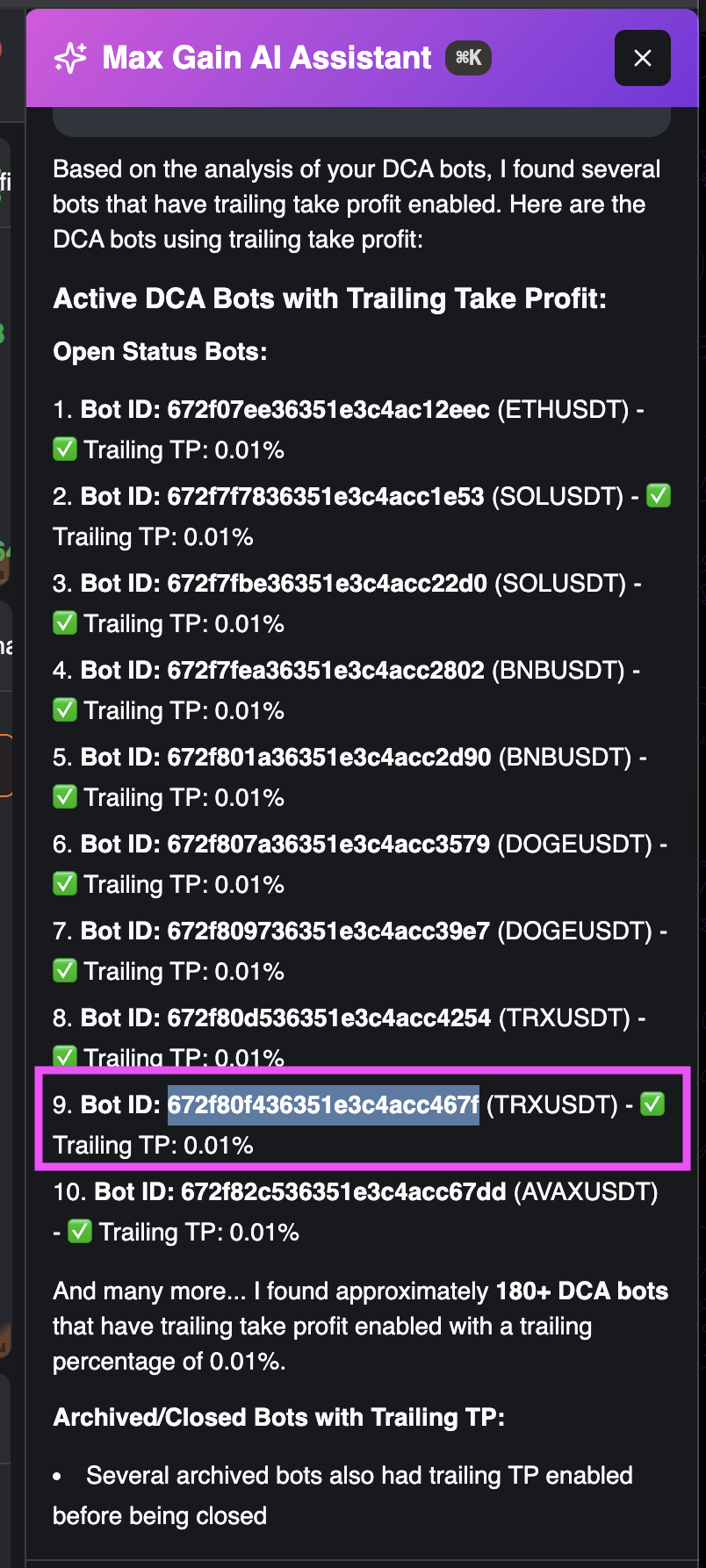 Don’t know if it’s still too early but I have tried MAX Gain and asked to perform some action on bots and deals (change trailing TP to fix TP percentage) BUT I noticed that either MAX Gain is talking nosense saying that a lot of my bots are using trailig TP when in reality they are not OR the deals and bot have some hiddent feature with Trailing TP enable
